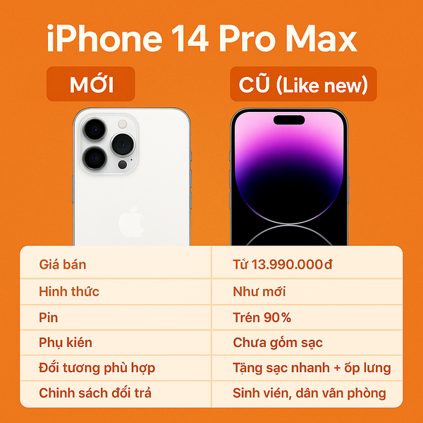 👉 Nếu bạn muốn tiết kiệm 30–40% chi phí mà vẫn có trải nghiệm cao cấp, iPhone 14 Pro Max cũ là lựa chọn cực kỳ thông minh!