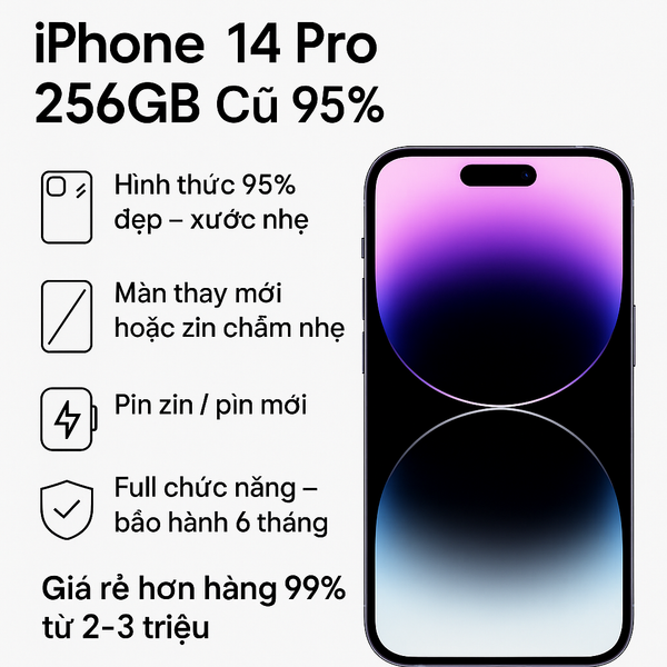 iPhone 14 Pro 256GB cũ 95% là lựa chọn hoàn hảo cho người cần chiếc iPhone mạnh mẽ, camera cao cấp, cùng dung lượng lớn gấp đôi bản 128GB nhưng mức giá lại cực kỳ dễ chịu. Với ngoại hình 95% đẹp, có thể xước nhẹ, màn hình thay mới hoặc zin chấm nhẹ và pin zin hoặc pin mới tùy chọn, sản phẩm đem lại trải nghiệm như máy mới nhưng tiết kiệm từ 2–3 triệu đồng so với máy 99%.